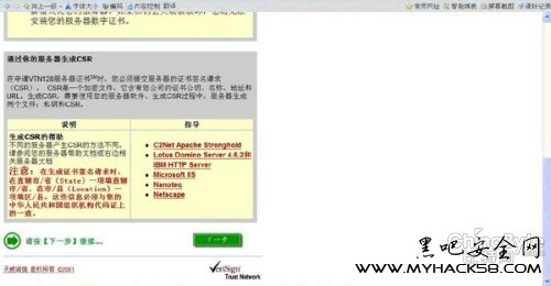 在此EV-SSL证书的注册和购买过程的最初两个步骤中,当我们按网站提供的注册要求完成域名验证和填写付款方式后,就会出现如图3所示的生成证书请求(CSR)界面。由于我们已经通过WEB服务器生成了证书请求文件,那么,现在就可以直接单击此界面中的“下一步”按钮继续下一步的注册过程。
