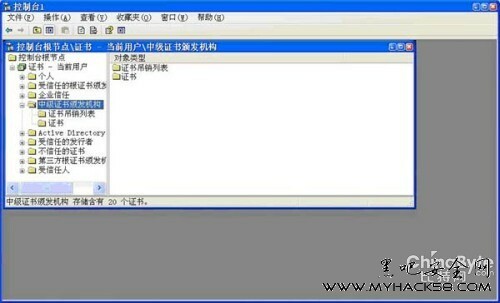 中间级证书的备份在证书管理控制台的“中间级证书颁发机构”项中选择并导出,其具体的操作过程与上述方式相同。