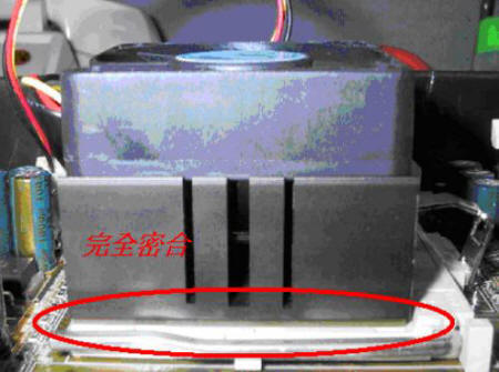 五、若是安装順序或方向错误时,则CPU与CPU风扇无法确实密合,如下图所示。此时CPU风扇沒有确实与CPU核心主体接触,无法达到散热效果,容易导致CPU过热而当机。因此必須将风扇拆下重装,拆下时请特別注意,不当的施力会将CPU本体压坏,导致CPU损毀而无法正常工作。