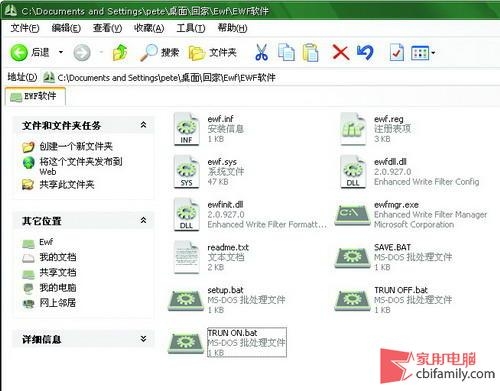 首先下载EWF(下载地址:http://www.cbifamily.com/download/201123.html),把它解压到一个非系统分区。如果你的系统安装在C盘,那么就把它解压到D:EWF。双击其中的setup.bat开始安装。需要注意的是EWF安装结束后系统会自动重启,因此在安装前一定要保存好数据。