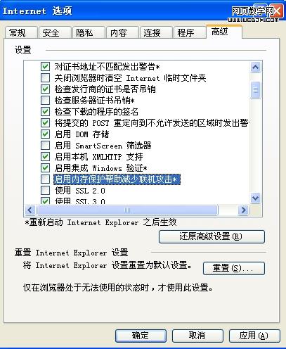 IE8中的这个选项就是开启继winxp sp2后系统新加入的DEP(数据执行保护)功能!