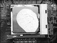 5. 若挤出散热膏分量太多的话,最好把Die以外的污染部分完全清洁干净后再试。因为如果不了解某种品牌散热膏的导电性,弄污电阻、电容及小金桥的散热膏已足以引起短路把CPU烧毁。