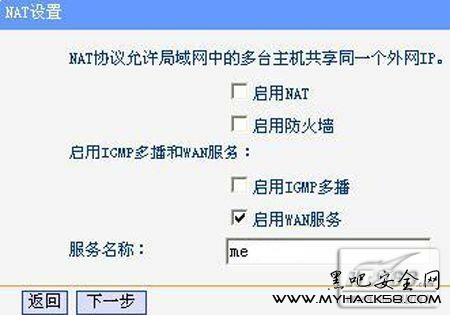 此外,对于ISP限制了宽带无线猫的路由的情况,可在此设置中启用WAN口服务或者IGMP多点传送(IP多点传送是针对点到点的传送和广播传送两种方式而言的,它是指在一定的组内对其成员进行的广播,是一种有限的广播,组中的某个成员发出的信息,组中的其它所有成员都能收到)功能。也能让2-3台电脑都新建一个网络连接,重复拨号同时上网。