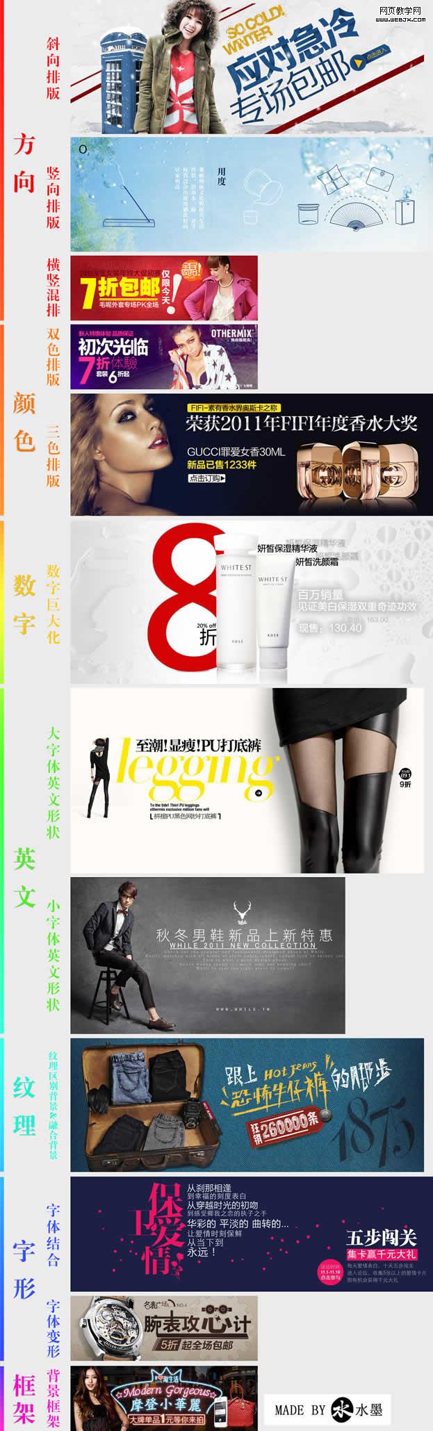 在不考虑模特照片的情况下,我们可以把文案排版的元素分为以下七种: