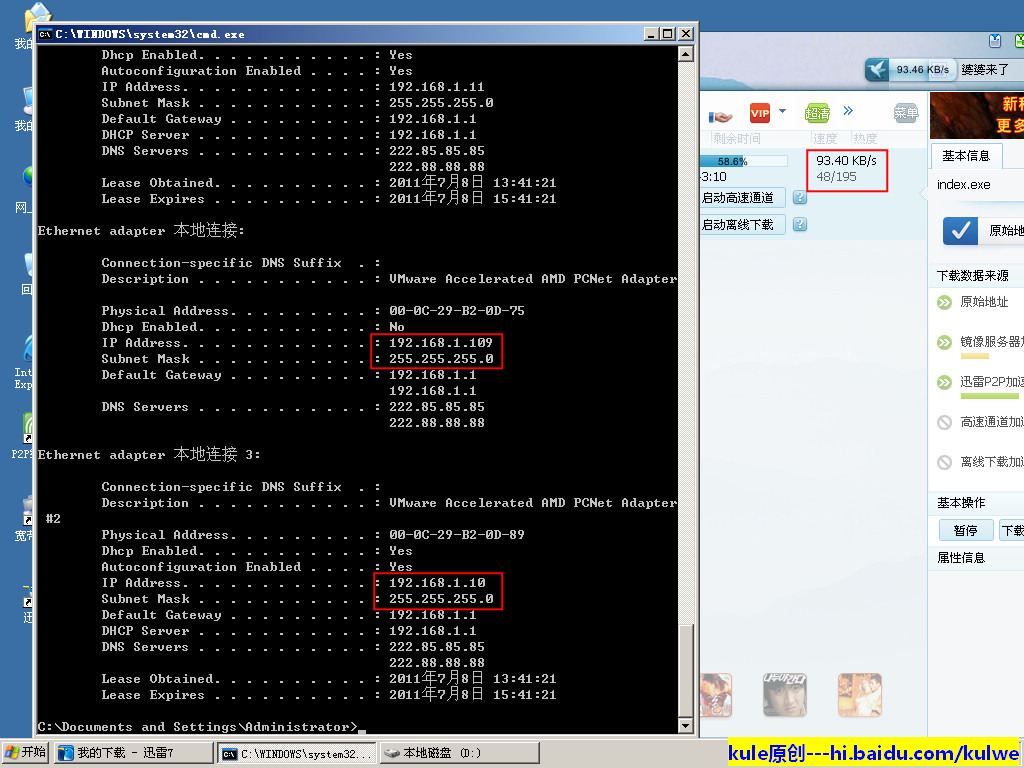 2.台式机上安装虚拟机,虚拟机和台式机都能达到50KB的速(虚拟机网卡采用桥接)。