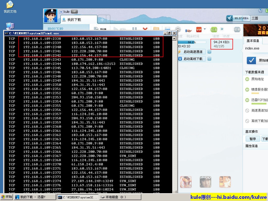 3.开启迅雷后,TCP链接成功分布到2个网卡上,速度已经超过50KB,稳定达到96KB。(未突破之前的网速最大为50KB,若超过50K后则瞬间又跌至40K左右,正是限速的作用。现在可以稳定在96KB了)