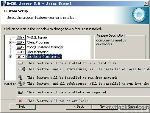 在“Developer Components(开发者部分)”上左键单击,选择“This feature, and all subfeatures, will be installed on local hard drive.”,即“此部分,及下属子部分内容,全部安装在本地硬盘上”。在上面的“MySQL Server(mysql服务器)”、“Client Programs(mysql客户端程序)”、“Documentation(文档)”也如此操作,以保证安装所有文件。点选“Change…”,手 动指定安装目录。