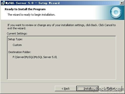 填上安装目录,我的是“F:\Server\MySQL\MySQL Server 5.0”,也建议不要放在与操作系统同一分区,这样可以防止系统备份还原的时