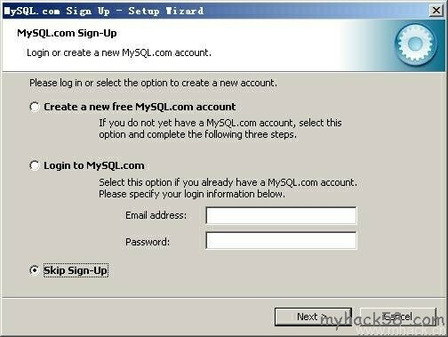 这里是询问你是否要注册一个mysql.com的账号,或是使用已有的账号登陆mysql.com,一般不需要了,点选“Skip Sign-Up”,按“Next”略过此步骤。