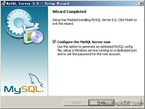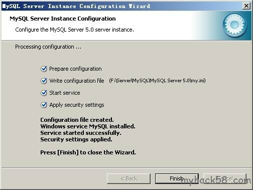 设置完毕,按“Finish”结束mysql的安装与配置——这里有一个比较常见的错误,就是不能“Start service”,一般出现在以前有安装mysql的服务器上,解决的办法,先保证以前安装的mysql服务器彻底卸载掉了;不行的话,检查是否按上面一 步所说,之前的密码是否有修改,照上面的操作;如果依然不行,将mysql安装目录下的data文件夹备份,然后删除,在安装完成后,将安装生成的 data文件夹删除,备份的data文件夹移回来,再重启mysql服务就可以了,这种情况下,可能需要将数据库检查一下,然后修复一次,防止数据出错。