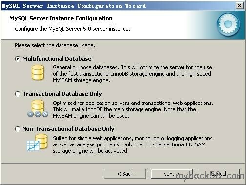 选择mysql数据库的大致用途,“Multifunctional Database(通 用多功能型,好)”、“Transactional Database Only(服务器类型,专注于事务处理,一般)”、“Non-Transactional Database Only(非事务处理型,较简单,主要做一些监控、记数用,对MyISAM数据类型的支持仅限于non-transactional),随自己的用途而选 择了,我这里选择“Transactional Database Only”,按“Next”继续。