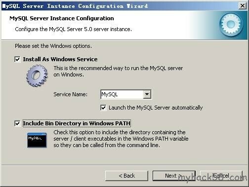 选择是否将mysql安装为windows服务,还可以指定Service Name(服务标识名称),是否将mysql的bin目录加入到Windows PATH(加入后,就可以直接使用bin下的文件,而不用指出目录名,比如连接,“mysql.exe -uusername -ppassword;”就可以了,不用指出mysql.exe的完整地址,很方便),我这里全部打上了勾,Service Name不变。按“Next”继续。