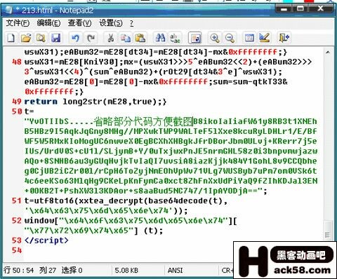 “document.write”在JAVASCRIPT是一条打印语句,而“eval”指的是eval()函数,这个函数可以把一个字符串当作一个JavaScript表达式一样去执行它。如果在JS的加密代码中碰上document.write,我们一般把它改成“alert”,如果遇到“eval”一般改成“document.write”。我们首先吧eval改为document.write然后运行看看结果: