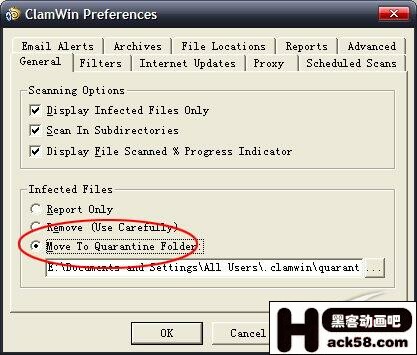 等ClamWin安装完毕之后,我们还需要对它进行一些必要的设置。右击ClamWin的任务栏图标,选择“Configure ClamWin”命令调出设置对话框,然后切换到“General”标签下,将“Infected”一项更改为“Move To Quarantine Folder”(相当于“病毒隔离”的意思)后点击“OK”即可,如图2所示。