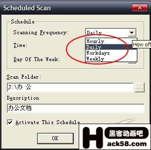 仍然右击任务栏处ClamWin图标,执行“Scheduler→Configure Scheduler”命令,然后再点击“Add”按钮新增一个定时任务。在定时查毒的设置框内我们可以看到,ClamWin能够以每小时、每天、每周或者每个工作日为频率进行扫描,应该说这样的设置已经足以满足我们日常的需要了。当然,最后那个“Activate This Schedule”(激活此项任务)复选框也一定要记住勾选上啊,如图4所示。