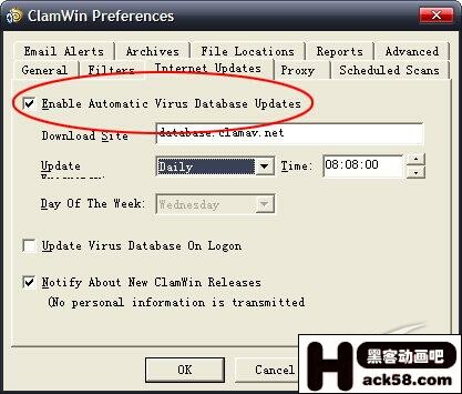 如果想让一款杀毒软件时刻保持“戒备状态”,最好的方法就是设置一个定时升级功能,让它的病毒库永远都是最新的。而这样一个有用的功能自然也不会被ClamWin遗忘,在设置窗口的“Internet Updates”标签下,我们可以看到较为详细的设置,其它的地方和别的功能非常类似,平时只要保证“Enable Automatic Virus Database Updates”复选框为选中状态即可,如图5所示。