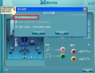 4.会出现以下对话框,勾选“禁用前面板插孔检测”(默认没有打勾的),保存退出,即可实现HD Audio前置麦克风的录音。