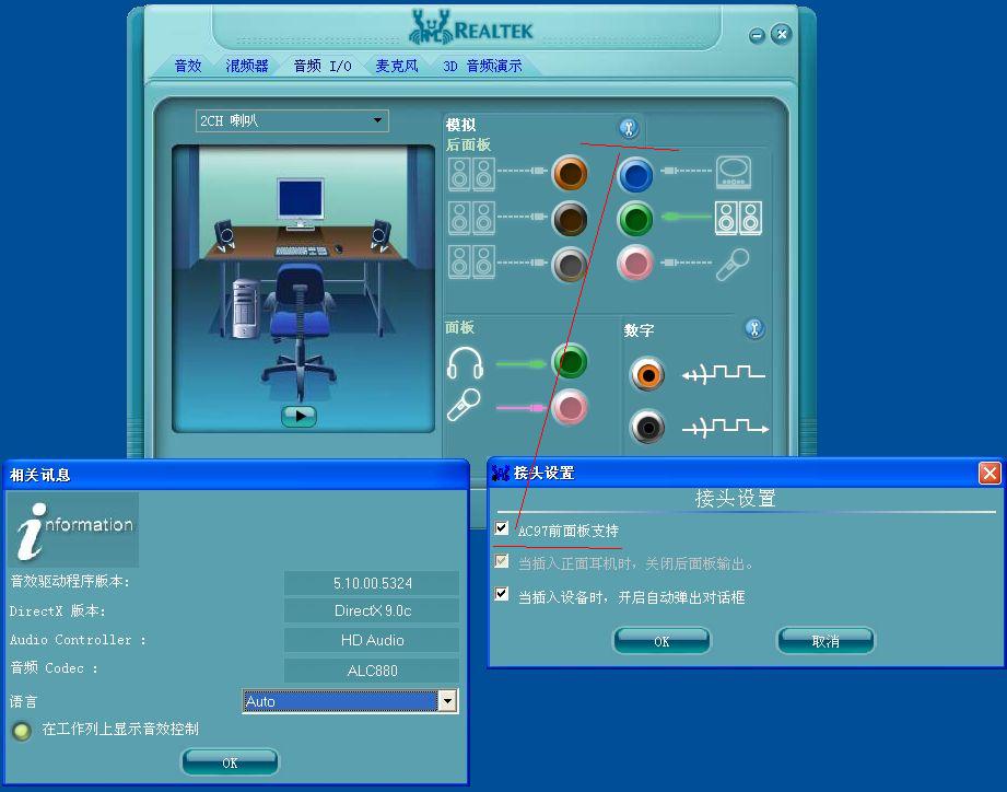 部分驱动版本的“接头设置”第一项会显示为“AC 97'前面板支持”,而不是“禁用前面板插孔检测”,这也是正常的,因为只有HD Audio规格的前面板才支持插孔检测功能。