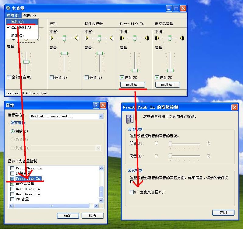 由于Realtek现有音频驱动未统一对驱动各功能块的中文称谓,甚至英文称谓,在使用时稍有不变,大家一例操作即可。例如前置麦克风目前的英文名叫常见的是Front Pink In(前置粉红色输入)、Front Mic(前置麦克风);后置麦克风之前一直都是“麦克风音量”的,最近几款驱动不知什么原因变了,目前见过的几个英文名有Rear Pink In(后置粉红色输入)、Rear Purple In(后置紫色输入)等。