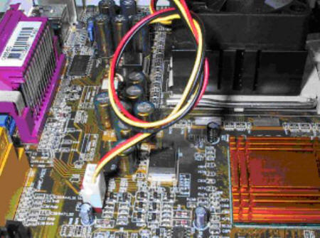 六、最后安装CPU风扇的电源线,注意:不要让电线缠住CPU风扇叶片,而导致风扇不运转,使风扇失去作用。