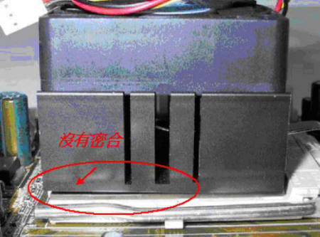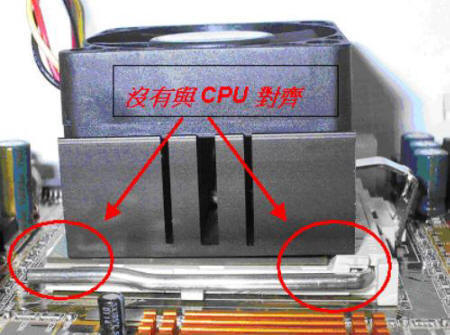 五、若是安装順序或方向错误时,则CPU与CPU风扇无法确实密合,如下图所示。此时CPU风扇沒有确实与CPU核心主体接触,无法达到散热效果,容易导致CPU过热而当机。因此必須将风扇拆下重装,拆下时请特別注意,不当的施力会将CPU本体压坏,导致CPU损毀而无法正常工作。