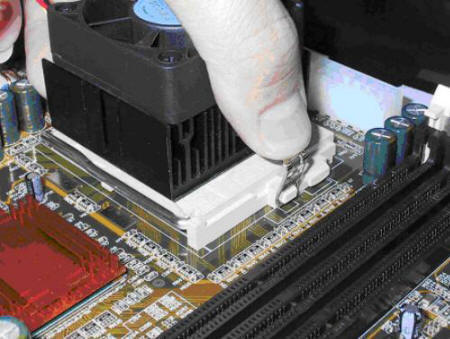 七、另外一种可能安装错误的情形:方向与順序都正确,但是沒有将风扇与CPU对齐,导致风扇的一边压在Socket上面,导致风扇沒有与CPU紧密接触,这样的安装也会让散热效果打折,应该避免。应该确实将风扇移至CPU正上方,与第四点的安裝方式相同。