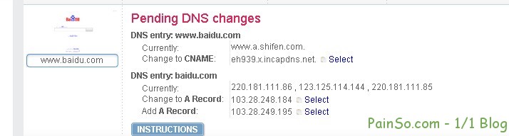 完了之后会给出叫你解析到他的地址,如我刚刚添加的百度.com的是 eh939.x.incapdns.net 把给你的地址复制下来回到dnspod把刚刚解析到dl.dropbox.com的记录值dl.dropbox.com替换成eh939.x.incapdns.net