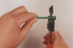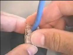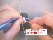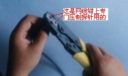 第2步,将探针套入网线的芯线上,一直要插到底,然后再把套上探针的芯线插入到同轴电缆专用压线钳中间的探针小圆孔中,压紧,使探针与网线芯线紧连,如图13所示。