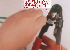 第4步:确认所有芯线都插到水晶头底部后,即可将插入网线的水晶头直接放入网线钳压线缺口中,如图3所示。因缺口结构与水晶头结构一样,一定要正确放入才能使后面压下网线钳手柄时所压位置正确。水晶头放好后即可压下网线钳手柄,一定要使劲,使水晶头的插针都能插入到网线芯线之中,与之接触良好。然后再用手轻轻拉一下网线与水晶头,看是否压紧,最好多压一次,最重要的是要注意所压位置一定要正确。