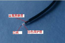 第1步:用同轴电缆专用剥线钳将细缆外皮剥除,露出芯线长约3mm,白色保护层约4mm,屏蔽层约8mm,如图12所示。