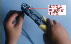 第4步:把套在网线的金属套环推到网线与BNC连接器连接处,再把网线钳的六角缺口卡在确定好的套环位置上,紧握网线钳手柄,紧压,使网线与BNC连接器通过BNC金属套环紧紧连接起来,如图15所示。压好后的金属套环呈六角形。