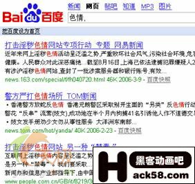 (2)百度:首页未见有相关“色情”网站,只收录了一些打击色情网站的新闻,不过当笔者转到百度搜索第二页时,却发面一个可以访问的色情链接,这说明在色情网站及关键字过滤方面,百度搜索引擎做的还够到位。