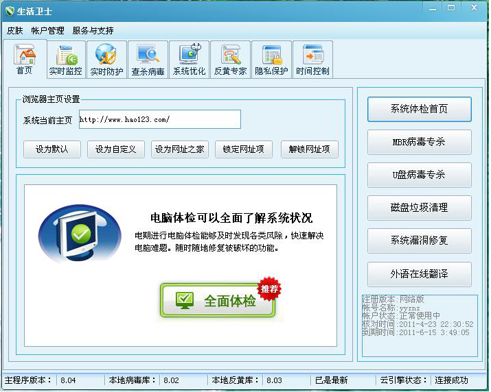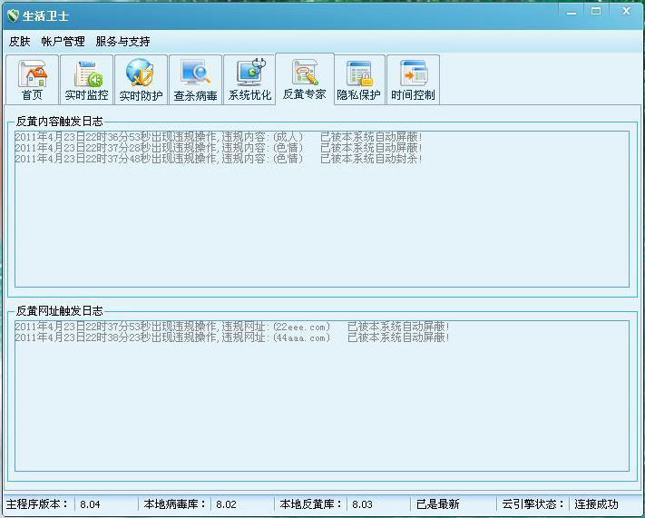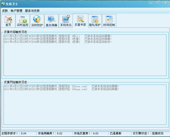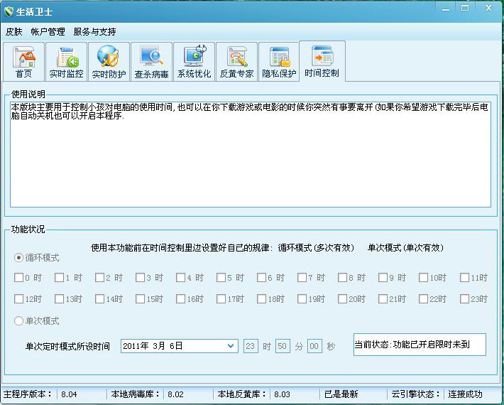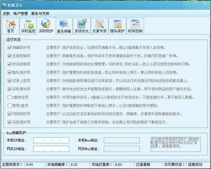 软件功能简要如下:生活卫士是一个集防毒、杀毒、反黄控制、隐私保护、时间控制、