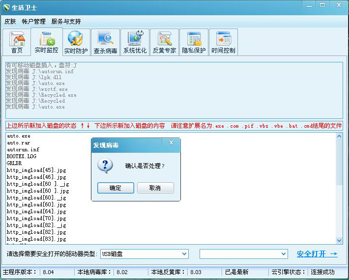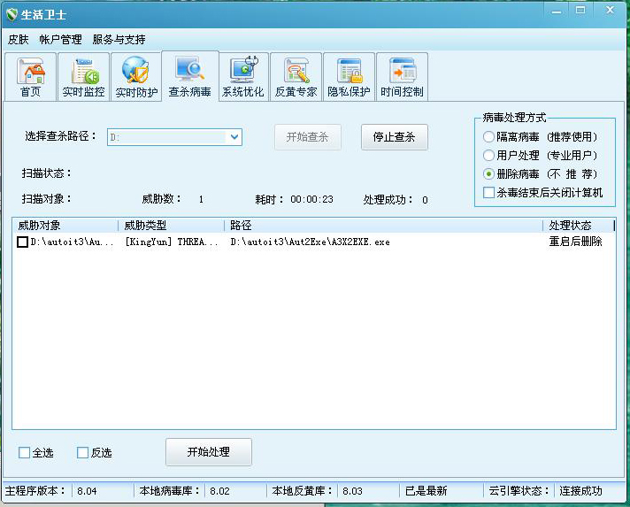 2、多种处理方式:隔离病毒、用户处理、直接删除等.