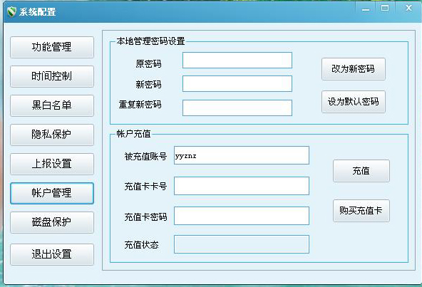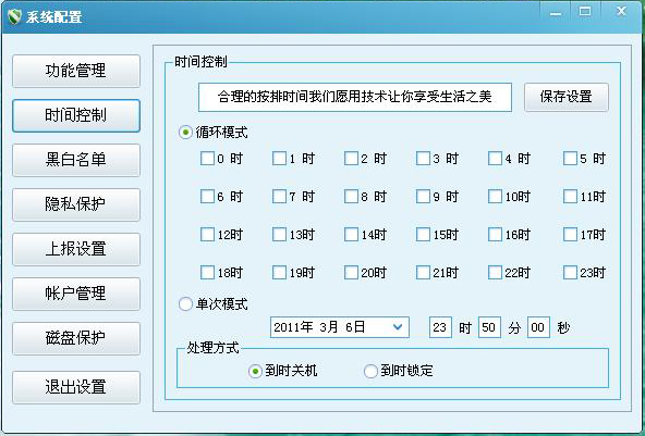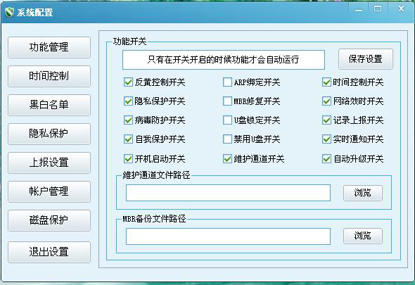 病毒防护、反黄控制、时间控制、隐私保护、记录上报、U盘锁定、